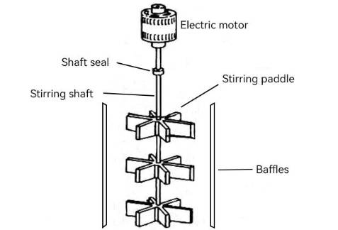 The motor and gearbox are to provide power for stirring; the stirring paddle and stirring shaft are the main parts of the operation; the shaft seal is to prevent the fermentation liquid from leaking out and contamination by stray bacteria; the baffle is to prevent large vortex on the liquid surface during stirring and promote the mixing of liquid in the tank.