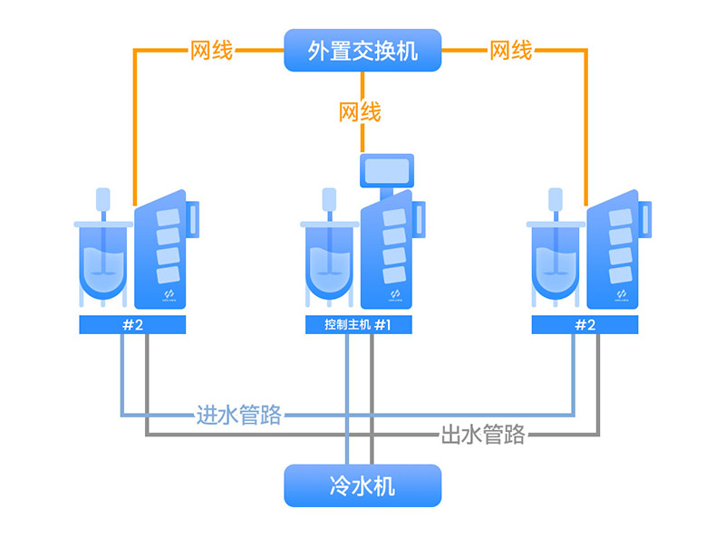 Cla多聯(lián)系統(tǒng)是類似搭積木的方式,將功能模板與機箱、罐體進行聯(lián)合。每個罐體的參數(shù)監(jiān)測電極線與機箱連接,另外置交換機通過網(wǎng)線將每個機箱連接,進行數(shù)據(jù)傳輸、控制,由其中一臺機箱配置14寸HMI進行總控。