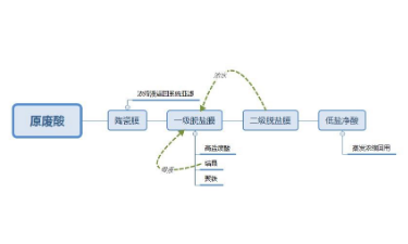廢酸經(jīng)陶瓷膜過濾后回收偏鈦酸,SS達(dá)到0.1ppm以下,產(chǎn)水進(jìn)行一級(jí)脫鹽(硫酸亞鐵與廢酸溶液分離),一級(jí)濃縮后的高鹽廢酸經(jīng)過結(jié)晶(真空或者冷凍),大量的硫酸亞鐵鹽析出,可以副產(chǎn)凈水絮凝劑(聚合硫酸鐵),結(jié)晶母液返回一級(jí)納濾膜繼續(xù)脫鹽。由于一級(jí)產(chǎn)水中仍然有部分亞鐵鹽,需要進(jìn)行二級(jí)脫鹽,二級(jí)產(chǎn)水中的亞鐵含量可以達(dá)到50PPM以下,硫酸可以直接蒸發(fā)回用,二級(jí)濃縮液返回一級(jí)繼續(xù)濃縮。此工藝基本達(dá)到工業(yè)廢水“零”排放標(biāo)準(zhǔn)。