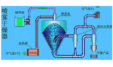 噴霧干燥是利用霧化器將料液分散為細小的霧滴,并在熱干燥介質(zhì)匯總迅速蒸發(fā)溶劑形成干粉的過程,一般噴霧干燥分為四個階段:料液霧化;霧群與熱干燥介質(zhì)接觸混合;霧滴的蒸發(fā)干燥;干燥產(chǎn)品與干燥介質(zhì)分離。