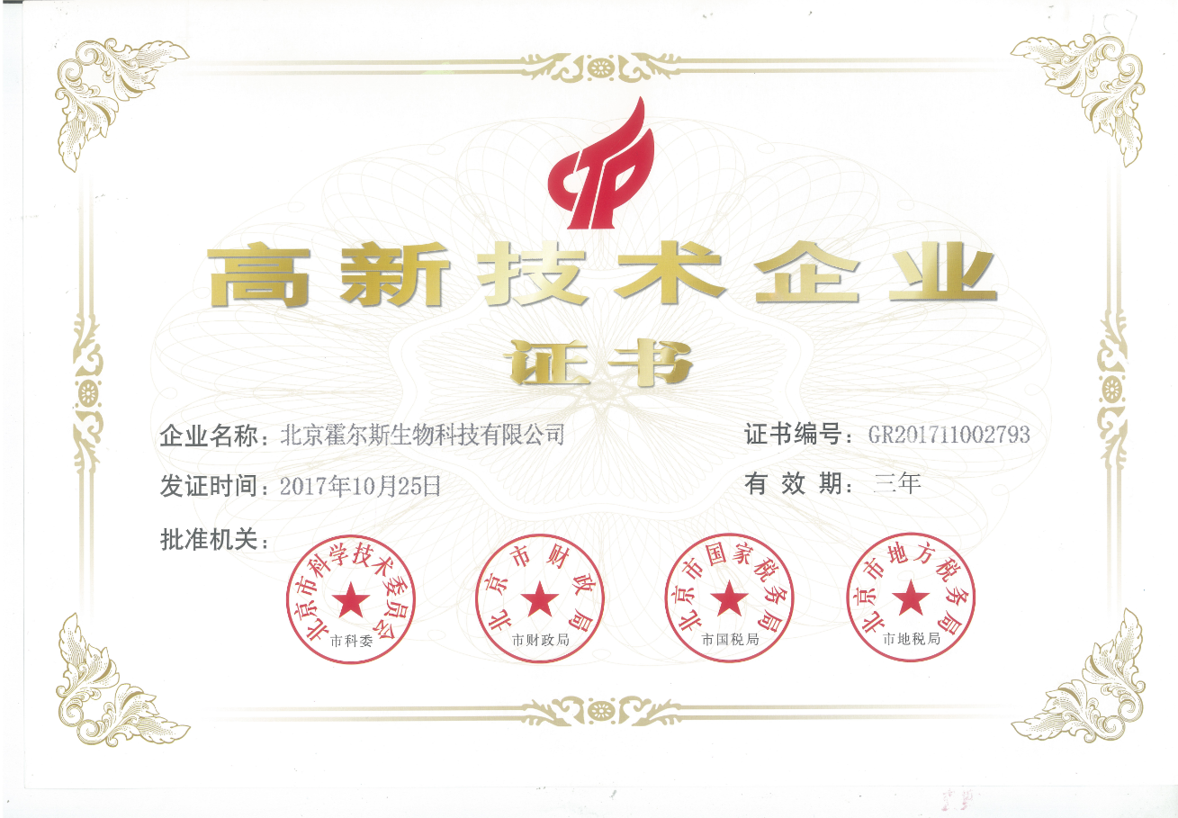 霍爾斯獲得北京市科委頒發(fā)的高新技術(shù)企業(yè)稱號