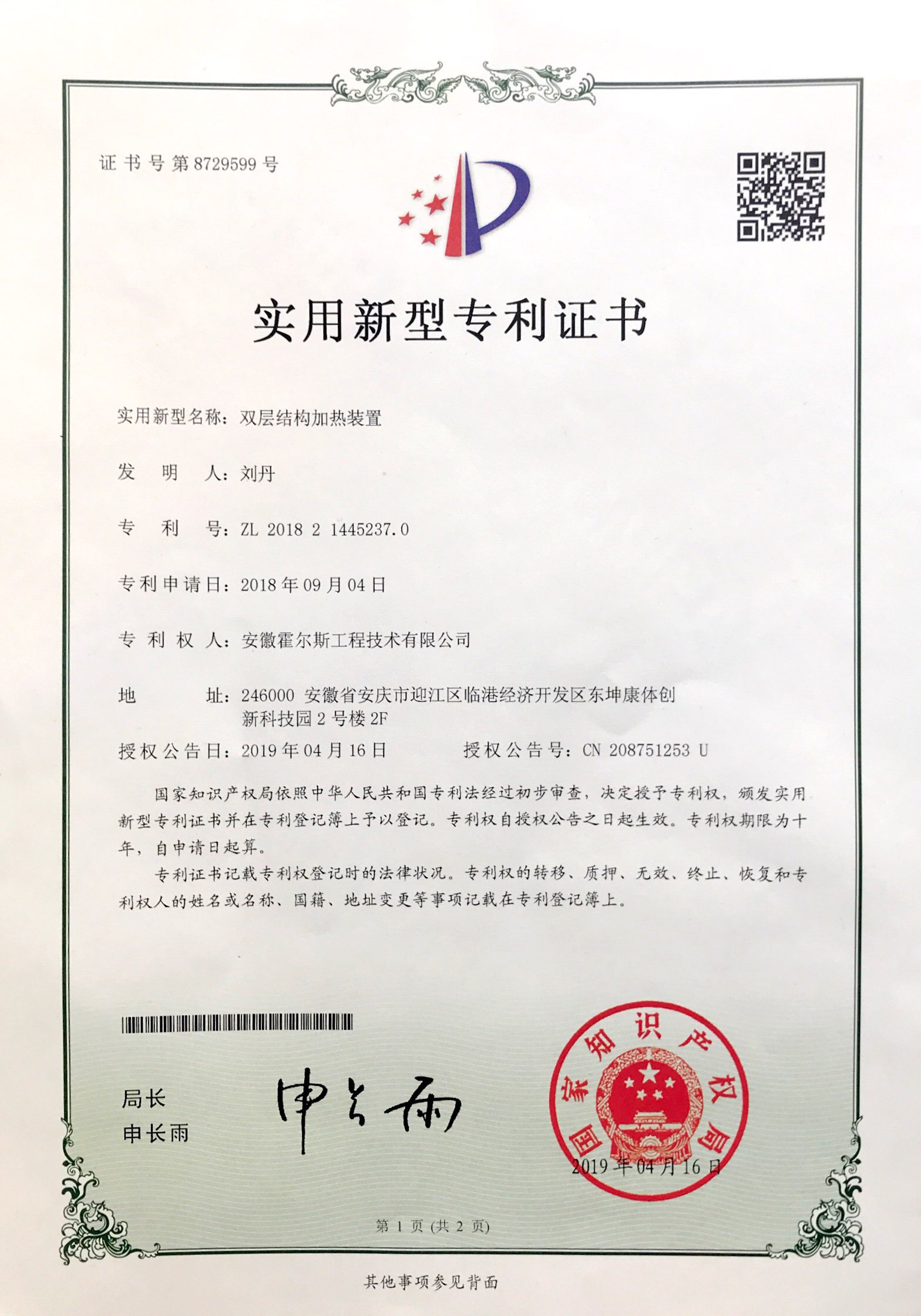 您現(xiàn)在閱讀的文章是:霍爾斯中試型噴霧干燥機(jī)雙層結(jié)構(gòu)加熱裝置榮獲國(guó)家專(zhuān)利證書(shū)。
